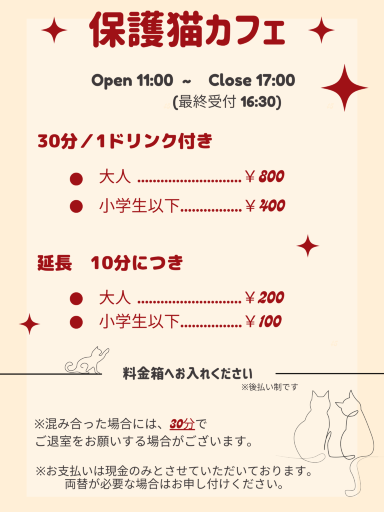 年末年始や臨時休診日には、保護猫カフェもお休みとなる場合がございます。金曜日以外の休業日につきましては、動物病院のお知らせページに掲載の「診療カレンダー」をご確認ください。